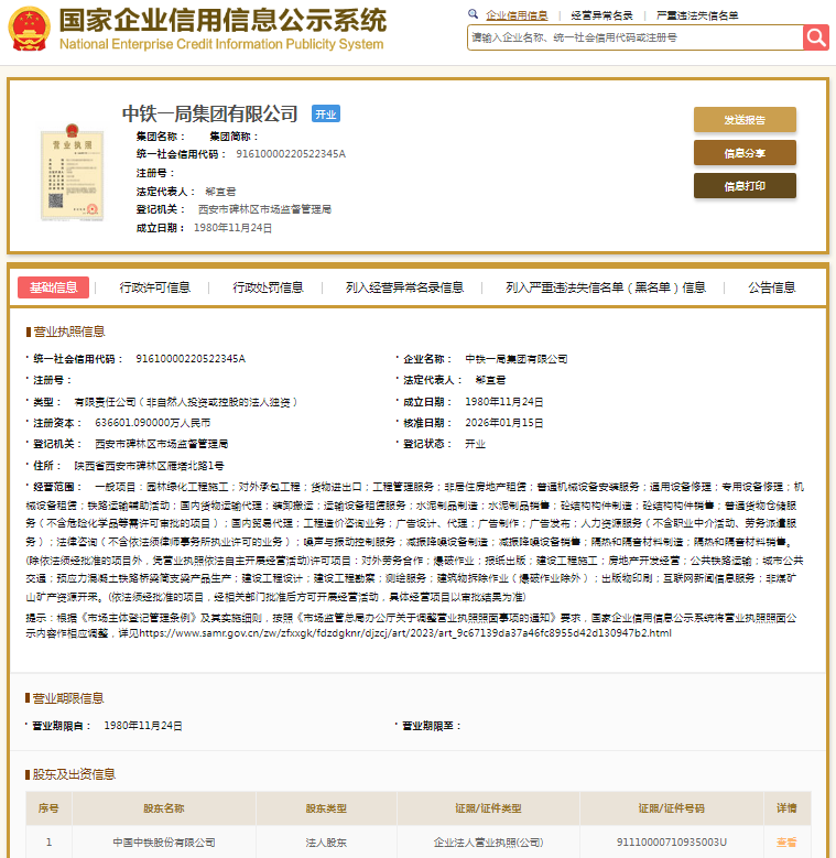 国家企业信用信息公示系统显示,中铁一局集团有限公司成立于1980年,注册资本636601.09万元人民币,法定代表人郗宜君,由中国中铁(601390.SH/00390.HK)全资持股。