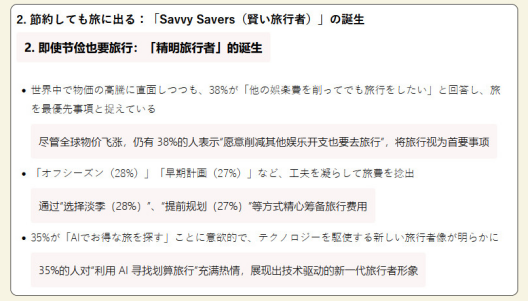 一份关于2025年全球旅行趋势的调查数据显示,尽管全球物价飞涨,仍有38%的人表示“愿意削减其他娱乐开支也要去旅行”,将旅行视为首要事项。