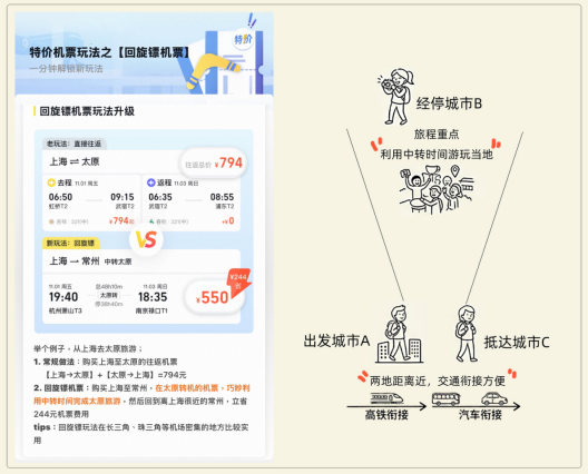 其核心在于联程机票:出发地与目的地距离近,却得飞去千里之外的城市长时间中转——充分利用经停时间,旅客能完成一次节奏紧凑的地方游。“回旋镖”有效规避了往返的高票价,有的甚至能省下酒店钱。