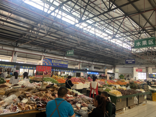 五一农贸市场有二层,一层主要销售生鲜粮油,二层主设水果区和蔬菜区