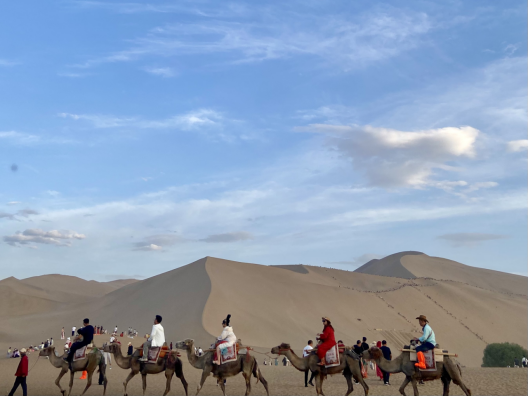 骆驼队在鸣沙山并排行走