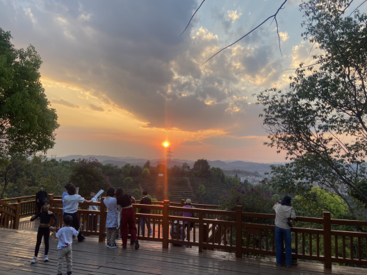 临近傍晚,朋友带家麒走了一段茶城健康步道。随着山势抬升的栈道被思茅松和各种阔叶树包围,每一次呼吸,都好像离自然更近一些。观景台的视野更开阔,城市夹在远处连绵的山峦与近处层叠的茶园之间。