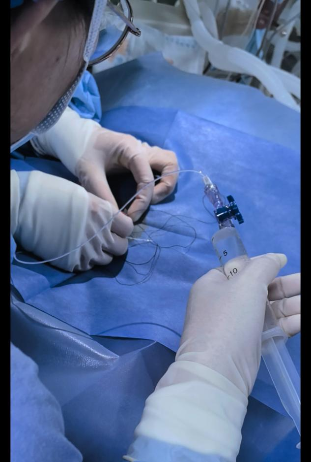 为保障后续救治工作的顺利开展,医疗团队凭借精湛的技术为宝宝们进行了脐静脉置管,成功建立起一条“生命线”,确保抢救药物和高营养液能够顺利输入宝宝体内。