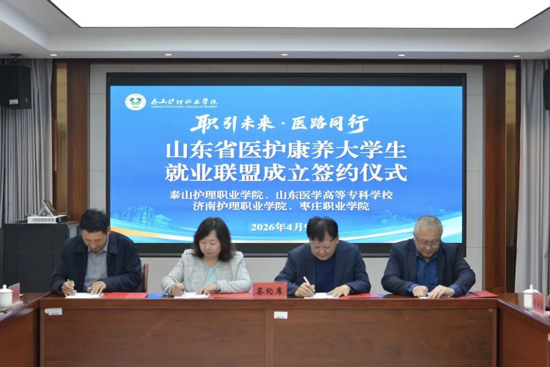 双选会当天,泰山护理职业学院、山东医学高等专科学校、济南护理职业学院、枣庄职业学院携手组建的山东省医护康养大学生就业联盟成立。四方共同签署了《医护康养就业联盟共建共享合作协议》,宣读了《医护康养毕业生高质量就业联合倡议书》,致力于破解医护康养类毕业生就业难题、整合优质教育与就业资源,助力“健康山东”建设,为区域卫生健康事业输送更多高素质技能型人才,开启校校协同、校企联动、共育人才、共促就业的崭新篇章。