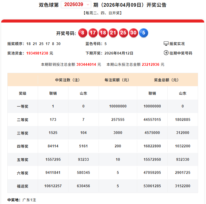 4月9日,双色球第2026039期开奖,红球号码:8、17、18、21、25、30,蓝球号码:5。当期销售3.93亿元,筹集公益金1.41亿元;中出一等奖1注,单注奖金1000万元,被广东购彩者幸运中得;截至目前,2026年双色球已中出17注1000万元一等奖。当期还中出二等奖173注,单注奖金25.75万元;中出“福运奖”1061.22万注,“福运奖”奖金合计超过5306万元;其中,山东中出“福运奖”63.04万注。下期一等奖奖池金额19.34亿元。