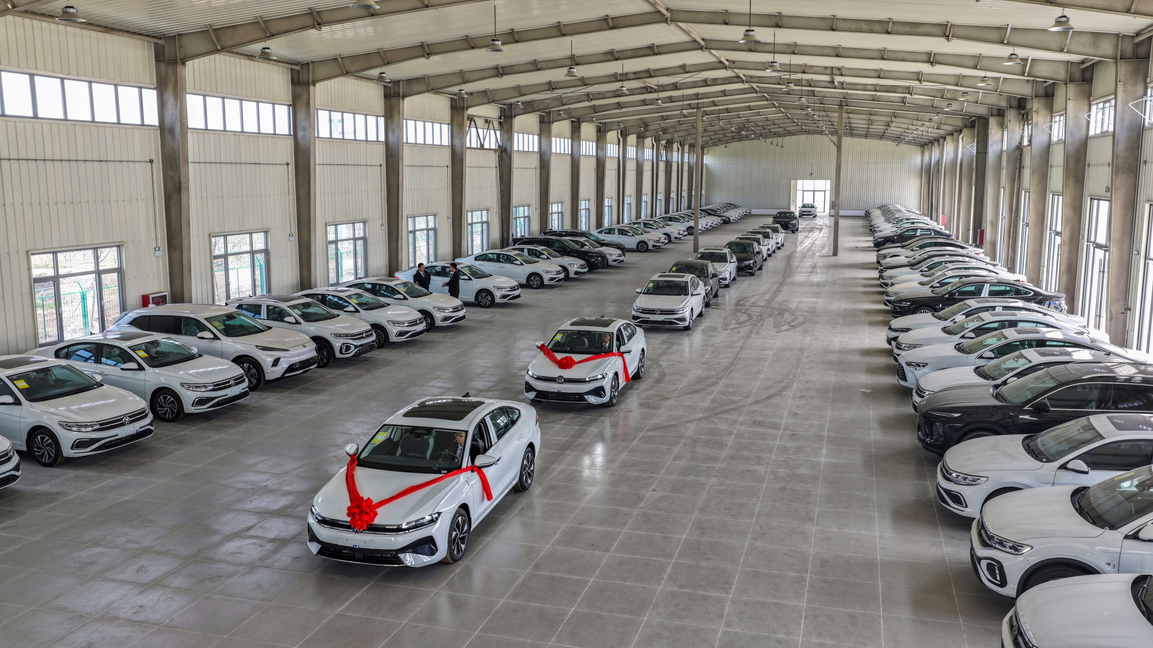 4月10日,在山东省乐陵市城投开泰汽贸城一汽车销售展厅内,销售人员正准备将系上红绸的汽车交付给消费者。