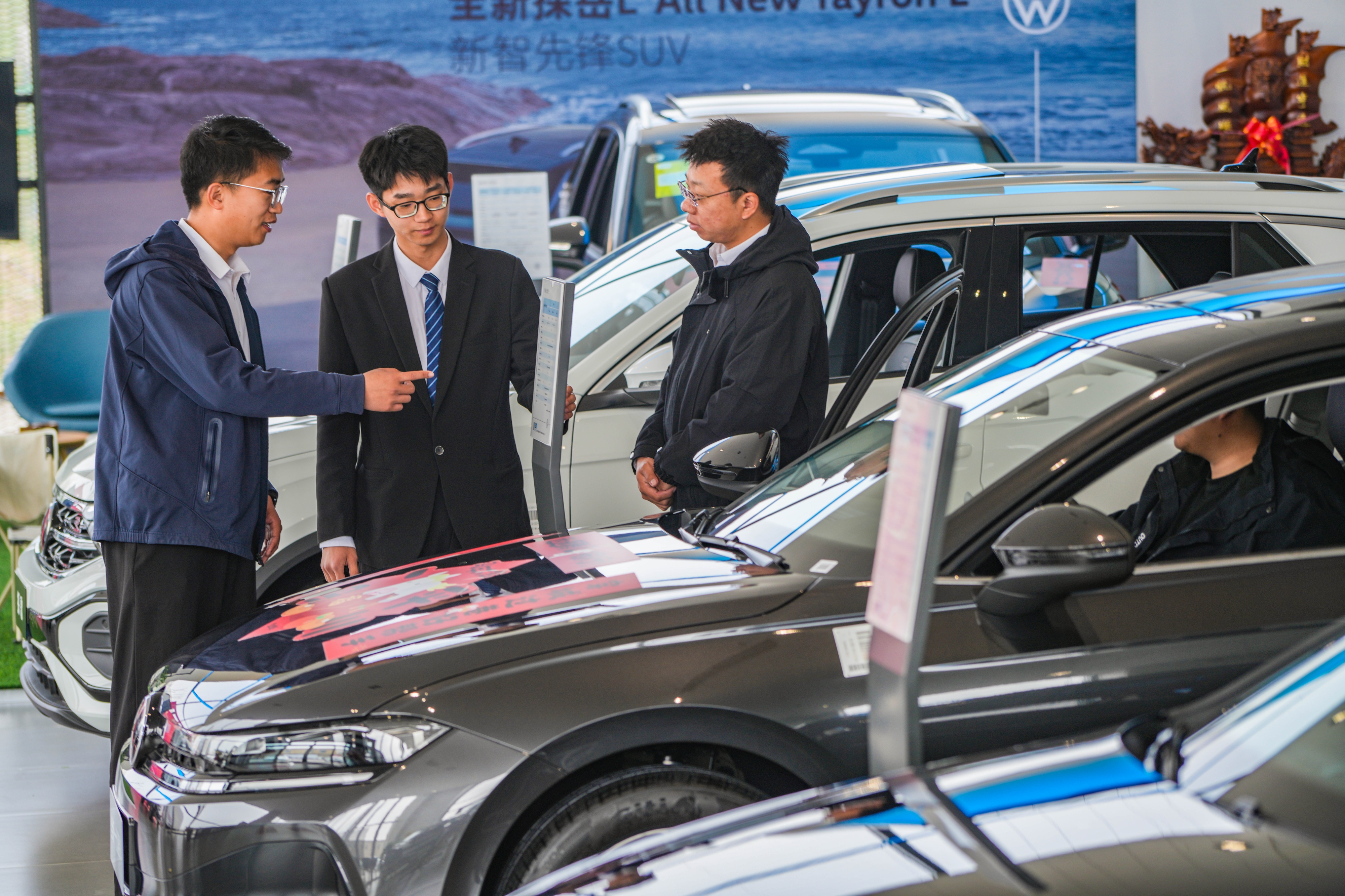 4月10日,在山东省乐陵市城投开泰汽贸城一汽车销售企业,顾客在向销售人员咨询汽车“以旧换新”补贴政策。