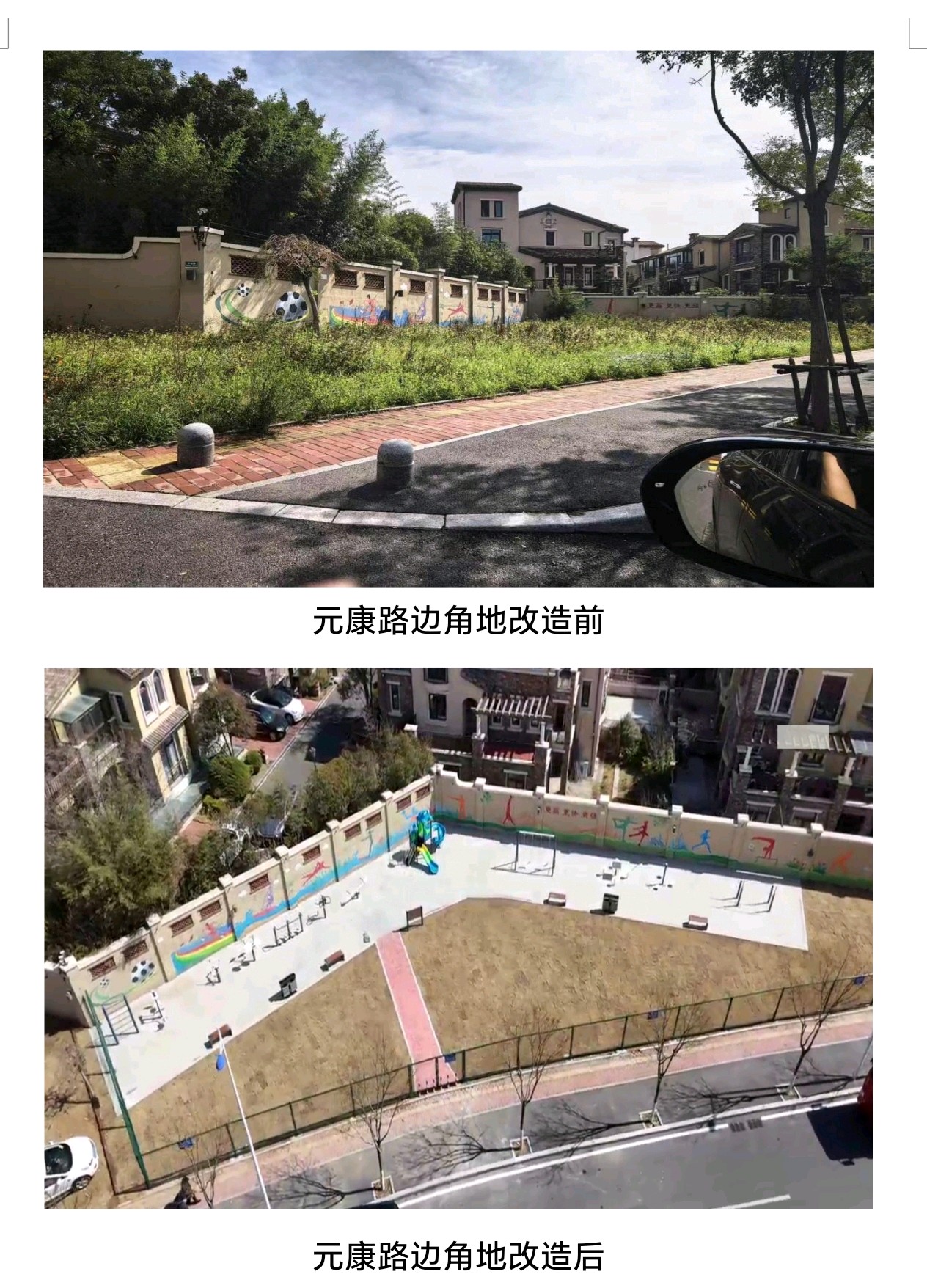 城阳区元康路边角地:原为紧邻小区的闲置空地,积存垃圾、杂草丛生。通过墙体彩绘、场地硬化、加装座椅和健身器材后,变身为居民喜爱的休闲活动空间。