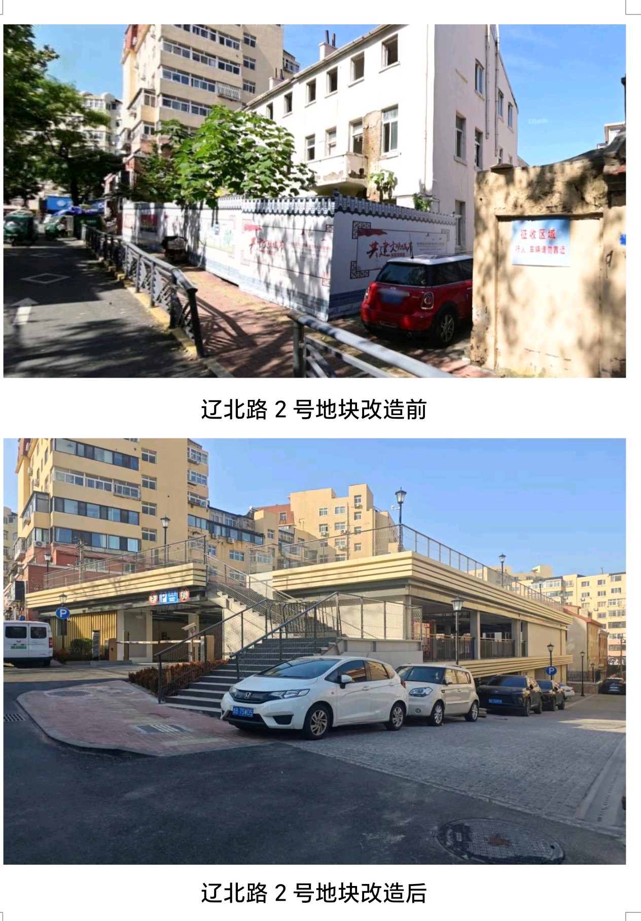 市北区辽北路2号地块:位于信号山历史文化街区内,利用两处征收拆除的老式居民楼空地,改造为一层停车场、二层室外健身区,同时解决“停车+休闲”需求。