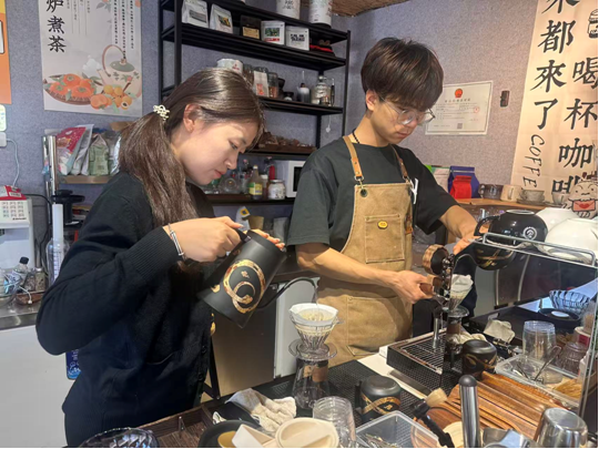 走进茶咖驿站,绿色主调清新柔和,自然风草席顶篷质朴雅致,温馨的布置搭配舒缓的音乐,每一处细节都透着松弛与舒适。吧台前,徐浩诚和王亚男忙碌的身影不停歇,研磨、冲泡、出品,一系列动作娴熟流畅;窗边,客人们静坐小憩,或品咖啡、或尝甜品,在氤氲香气中悠闲享受乡村午后的慢时光。