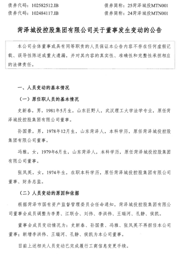 4月9日,菏泽城投控股集团有限公司(下称“菏泽城投控股集团”)发布董事变动公告。根据菏泽市国有资产监督管理委员会的任命通知,史新春、孙国景、冯雅、张凤英不再担任公司董事职务,同时新增李洪伟、王瑞河、孔静、侯凯四人为新任董事。目前,相关人事变动已履行工商信息变更手续。