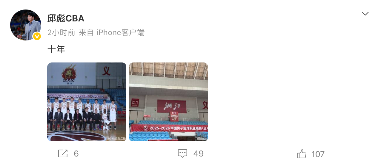 赛前踩场时,邱彪在社交媒体上发文感慨:“十年”,并配上了过去的合影和现在的场馆照片。重回义乌这片故土,这位浙江队旧将率领齐鲁弟子能打出怎样的表现,无疑是本场比赛一大看点。