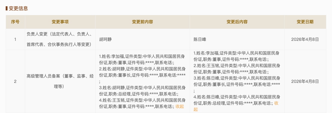 根据公示系统4月8日更新的信息,胡珂静卸任青岛金水控股集团董事长、总经理职务,由陈日峰接任;同时,公司法定代表人由胡珂静变更为陈日峰。