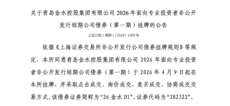 值得一提的是,据上交所官网披露,“青岛金水控股集团有限公司2026年面向专业投资者非公开发行短期公司债券”(第一期)于4月9日起在上交所挂牌。