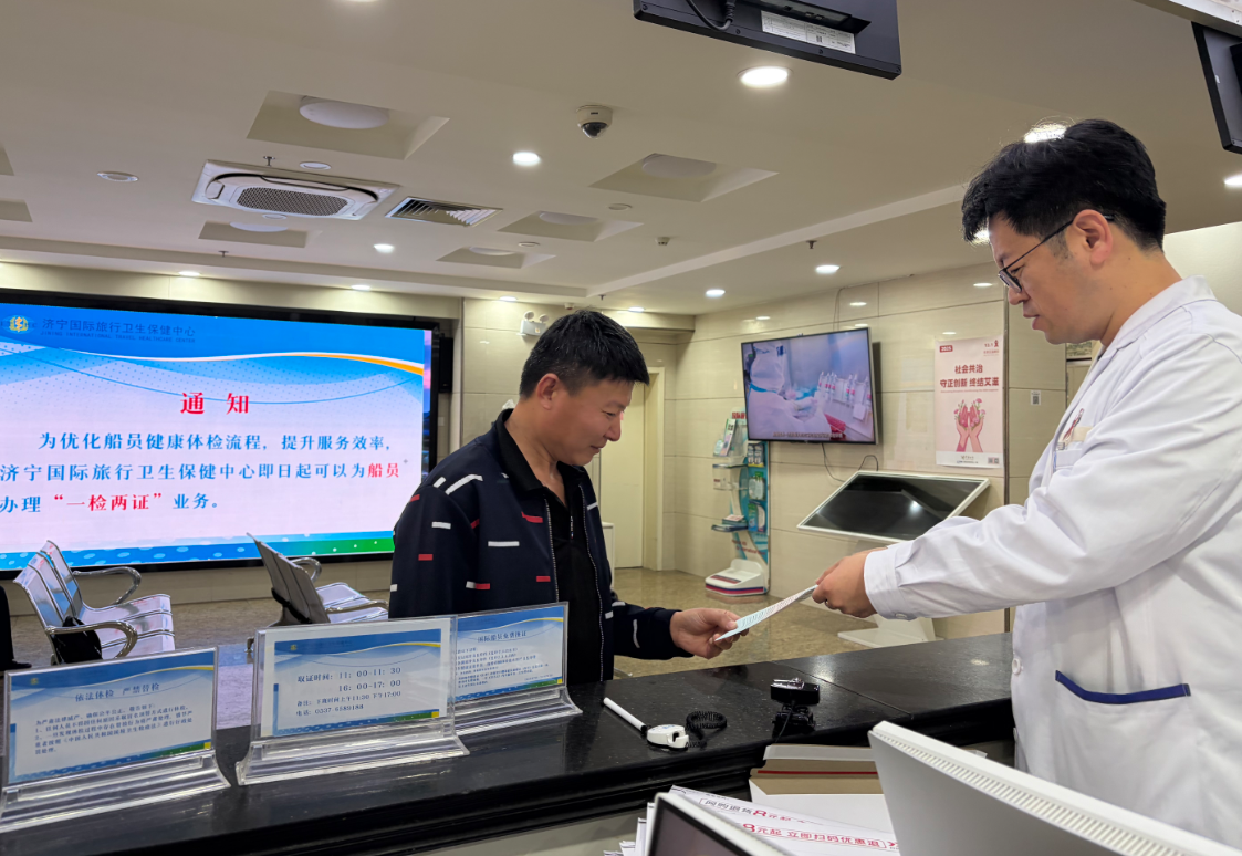 济宁海关内设国际旅行卫生保健中心,是海关总署设立在鲁西南地区唯一国际旅行卫生保健定点机构,承担出入境人员健康体检、预防接种、传染病监测等核心职能,服务覆盖鲁西南及周边地区劳务、商务、留学、交通等出入境人群。此前,鲁西南地区海船船员办理“双证”需分别前往海关、海事等多个部门,不仅需重复体检、且增加交通、时间、经济成本。针对以上痛点,济宁海关主动优化服务供给,完善场地、设备、人员与流程,严格对标海事局船员体检标准,顺利通过资质审核,实现服务升级。