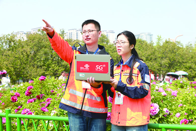 菏泽联通网络工程人员在牡丹园测试网络信号