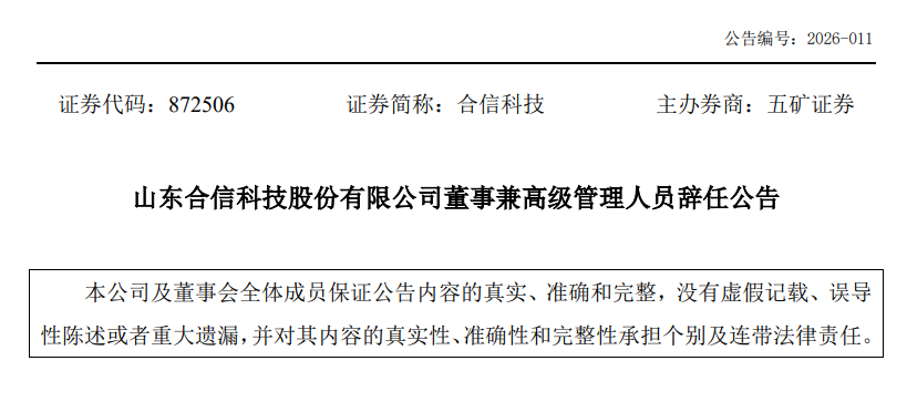 4月9日晚间,山东合信科技股份有限公司(证券代码:872506,证券简称:合信科技)发布公告称,公司董事会于4月8日收到董事兼高级管理人员孙挚国递交的辞职报告,其因个人原因申请辞去公司董事、总经理及财务负责人职务,辞职后将不再担任公司任何职务。