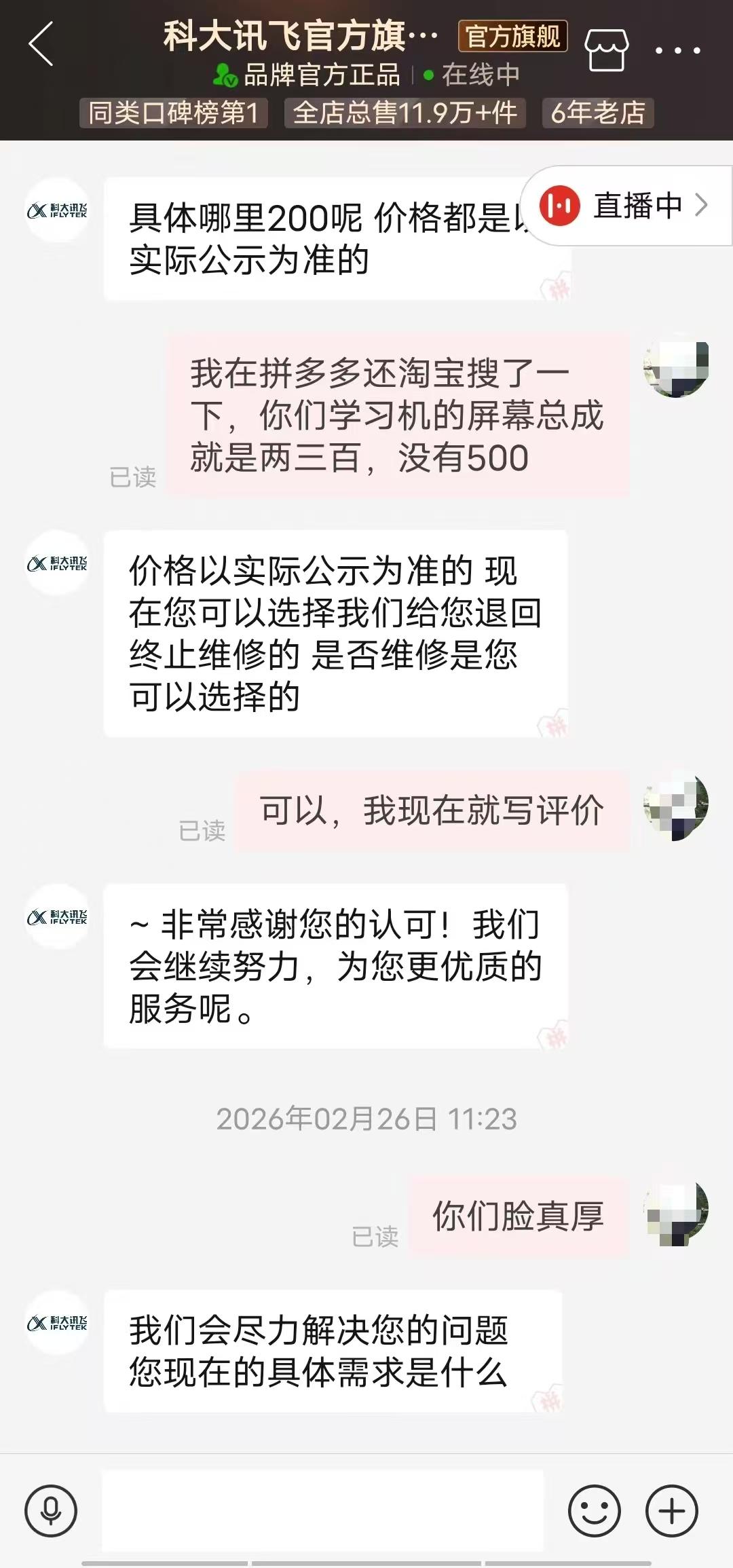 除了过保即坏,维修价格虚高、售后态度强硬也让消费者难以接受。市民杨先生的科大讯飞AI学习机P30因孩子使用不慎进水,屏幕出现故障。“市场价200元就能买到的屏幕总成,官方报价要590元,还说因为在保修期内,优惠后收530元。”杨先生说,工作人员全程态度傲慢,出口闭口都是“官方报价”,让他难以接受。