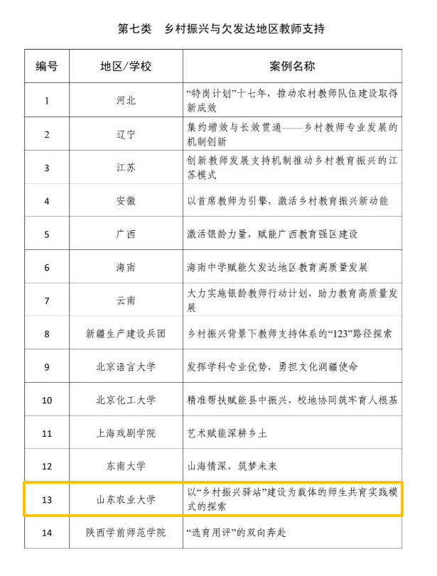 近日,由教育部教师工作司指导、中国教育报刊社组织征集与编制的“新时代高水平教师队伍建设创新案例(2025)”正式发布,山东农业大学党委教师工作部申报的《以“乡村振兴驿站”建设为载体的师生共育实践模式的探索》成功入选第七类“乡村振兴与欠发达地区教师支持”类别,该类别全国仅16个项目入选,成为全国高校以实践育人、推动教师队伍建设、服务乡村振兴的典型代表。