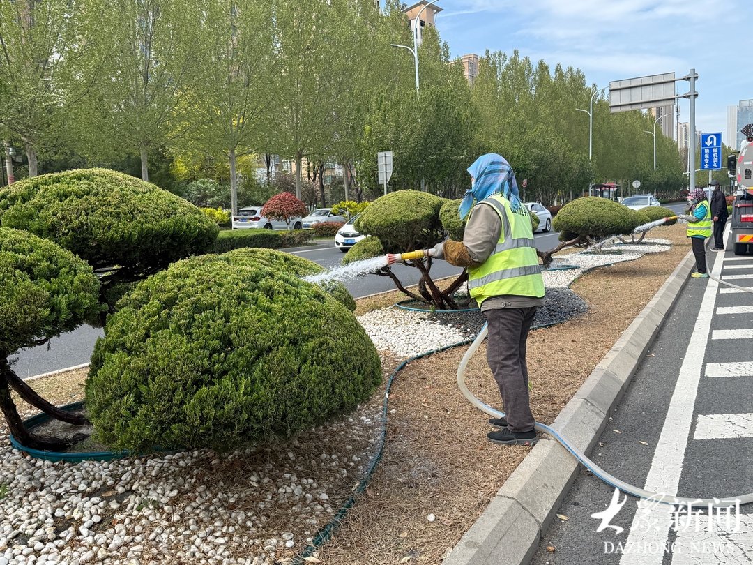 张店区综合行政执法局养护科工作人员汲薇介绍:“我们持续开展植被修剪作业,对道路、绿地内的乔灌木和绿篱进行规整修剪,清理枯死枝条。截至目前,累计修剪乔灌木3.1万株、绿篱3.5万平方米。同时,同步开展绿地清园整治,清理枯枝杂物,消除绿化管护死角。针对春季病虫害,我们集中喷施石硫合剂和刺蛾防治药物,从源头降低病虫害发生率。此外,根据土壤墒情合理开展绿植浇灌作业,保障苗木水分供给,促进植被健康生长。”