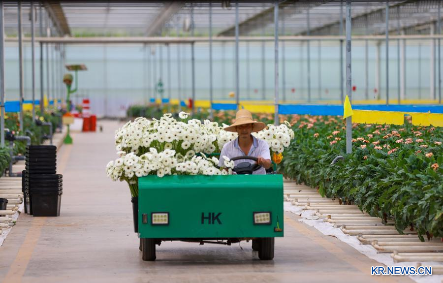 카이위안 국가현대농업산업단지에서 국화를 수확하는 농민. (카이위안시 융합미디어센터 제공)