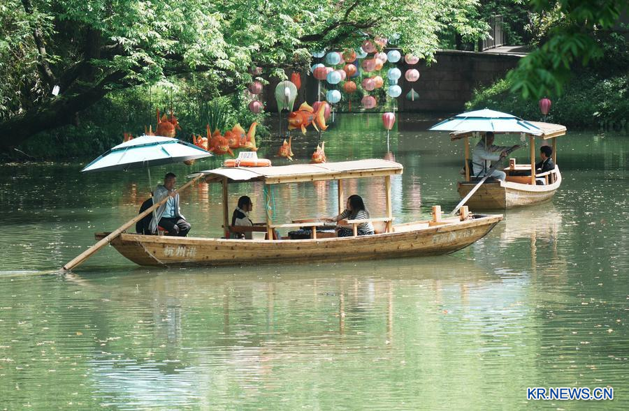 지난 5일 관광객들이 저장(浙江)성 항저우(杭州)시 시시(西溪)국가습지공원에서 배를 타며 즐거운 시간을 보내고 있다. (사진/신화통신)