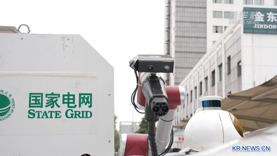 저장(浙江)성 진화(金華)시의 한 스마트 충전 서비스센터에서 이동식 에너지 저장 로봇이 전기차 충전을 준비 중이다. (영상캡처/신화통신)