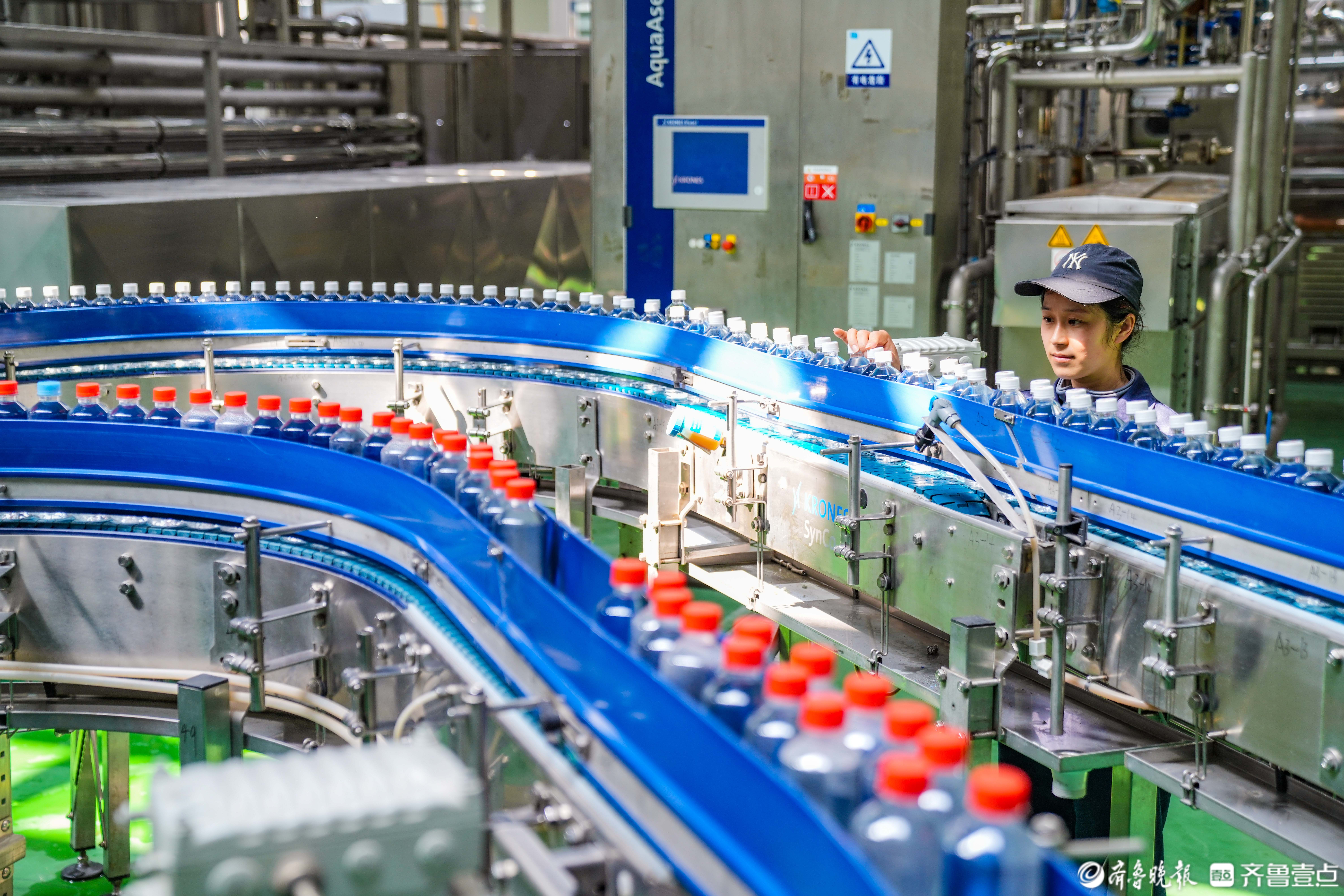 山东省乐陵市汇源果汁数字化生产车间内,技术工人在瓶装饮品自动生产线旁巡检,把控产品质量。