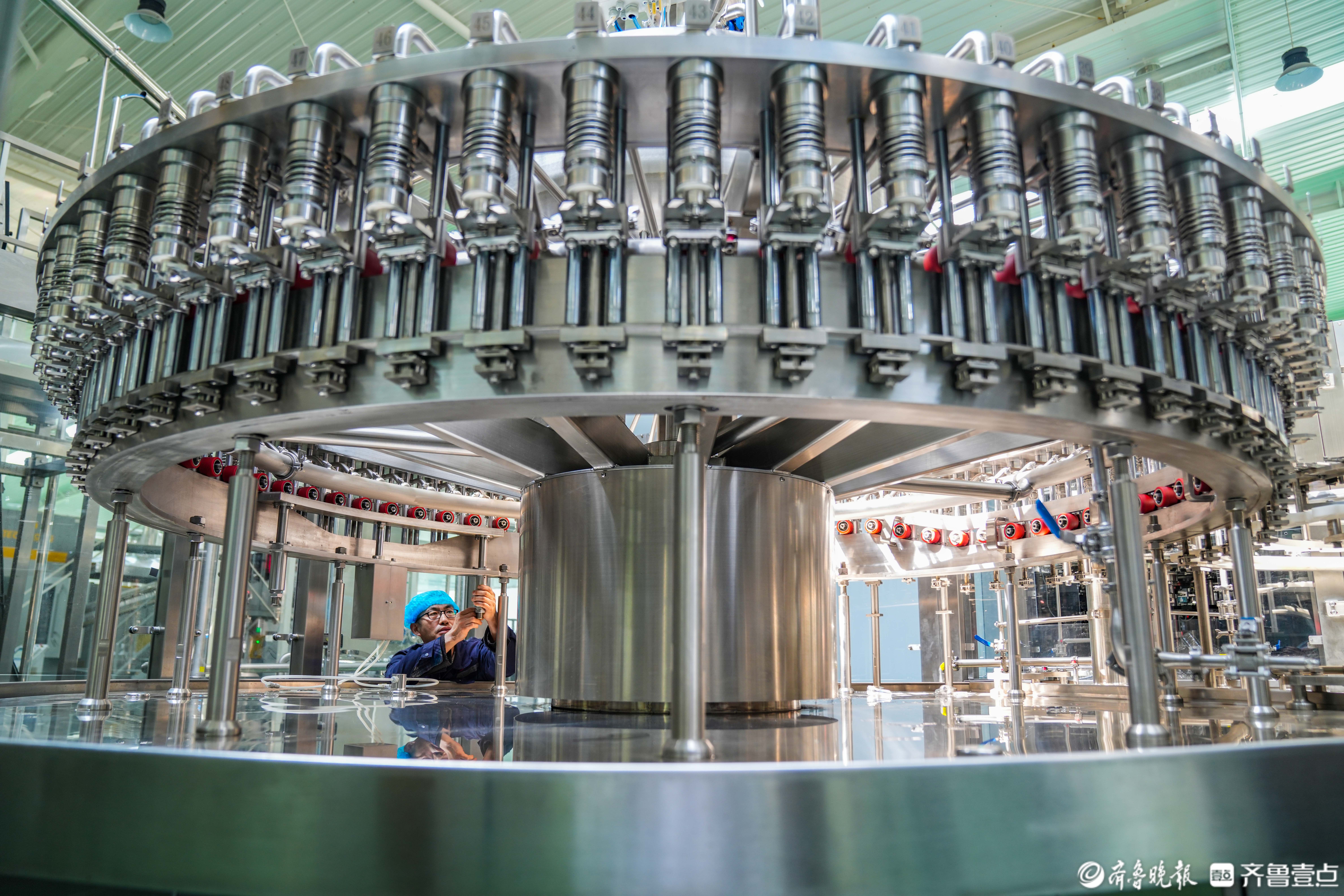 山东省乐陵市汇源果汁数字化生产车间内,技术工人对高速灌装设备进行巡检,确保生产精度。