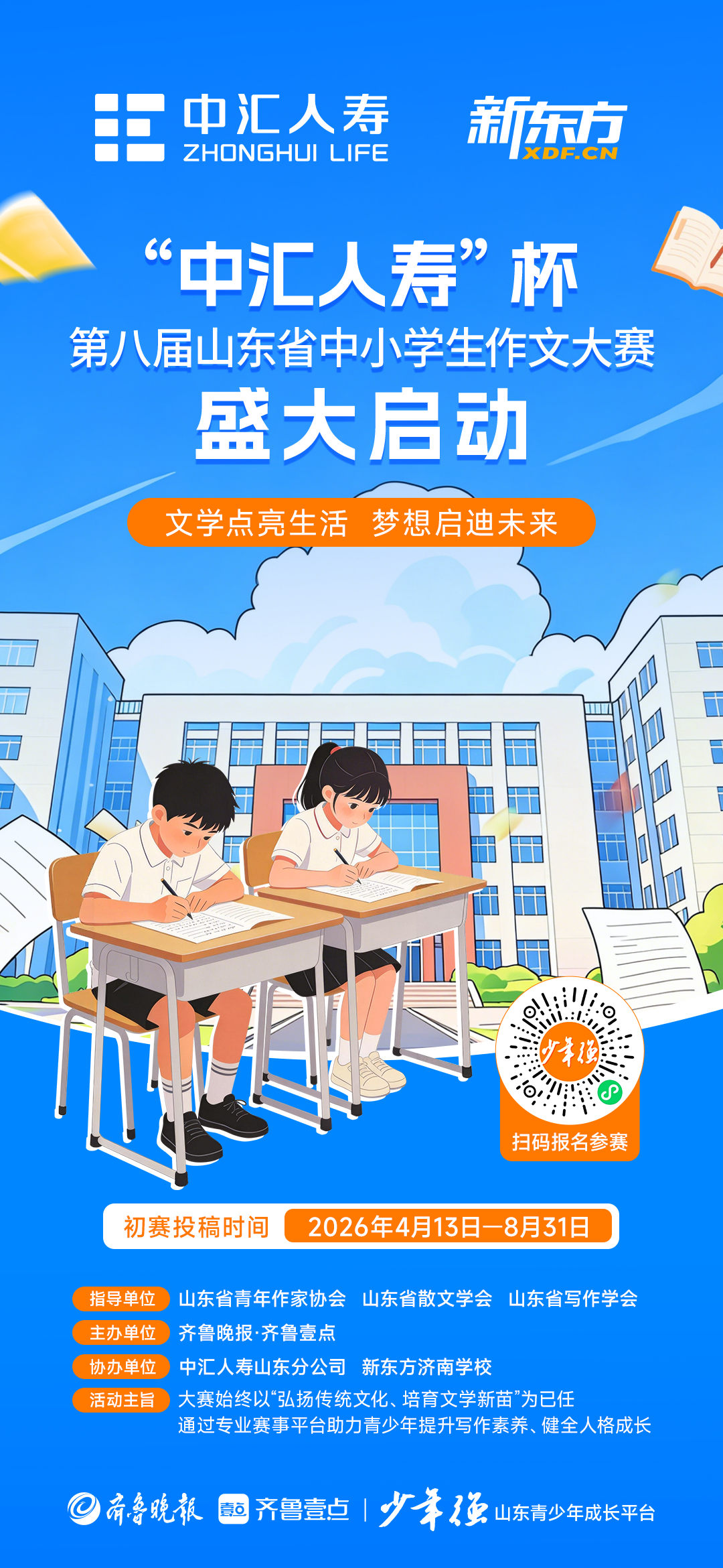 大赛由齐鲁晚报·齐鲁壹点主办,并联合山东省青年作家协会、山东省散文学会、山东省写作学会共同打造。大赛始终以“弘扬传统文化、培育文学新苗”为己任,通过专业赛事平台助力青少年提升写作素养、健全人格成长,本届大赛由中汇人寿山东分公司冠名、新东方济南学校协办。