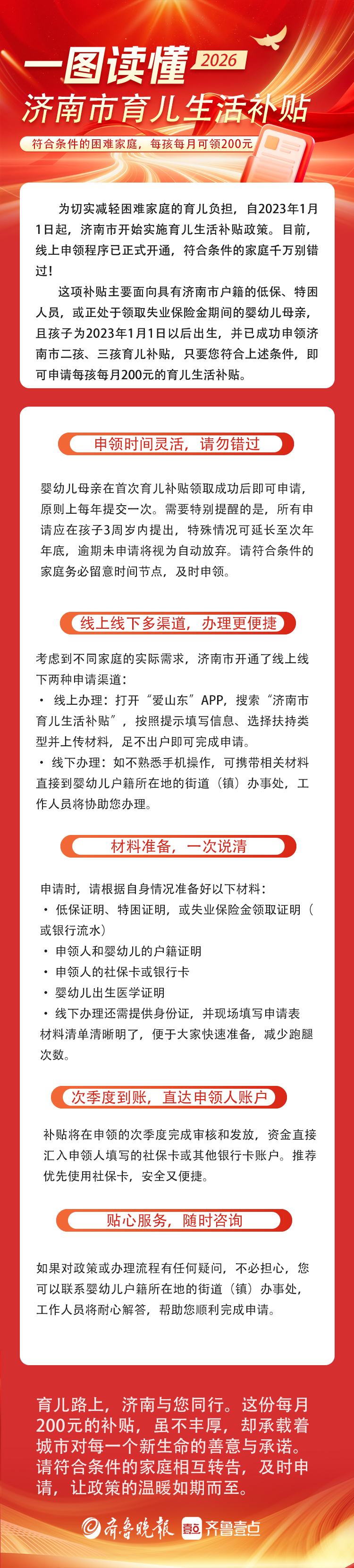 育儿路上,济南与您同行。这份每月200元的补贴,虽不丰厚,却承载着城市对每一个新生命的善意与承诺。请符合条件的家庭相互转告,及时申请,让政策的温暖如期而至。