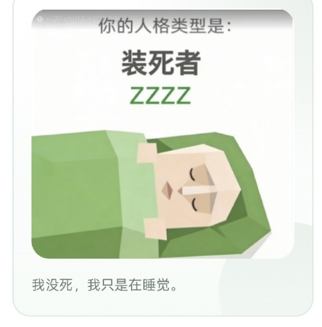 以SBTI中的一个典型结果“装死者(ZZZZ)”为例,其描述是:“面对压力选择关机躺平,用静止和沉默来应对。”看似荒诞,却精准击中了许多人的真实状态。
