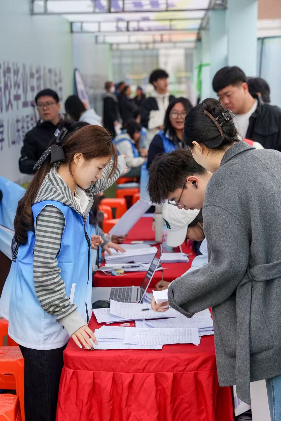 上午9时,双选会现场已是人流如织,毕业生们手持精心准备的简历穿梭于各个招聘展位之间,认真了解岗位需求、薪资待遇与发展前景,积极与招聘负责人交流沟通。