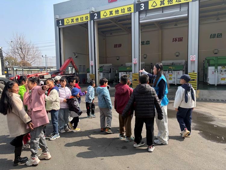 随后,队伍前往中韩街道转运中心和可回收物分拣中心,工作人员带领大家系统了解了生活垃圾“分类投放—分类收集—分类运输—终端处置”的全链条流程,让学生们更直观地感受现代垃圾分类体系的智能化管理与规范运作,深刻认识到前端分类对后端处理的重要意义。
