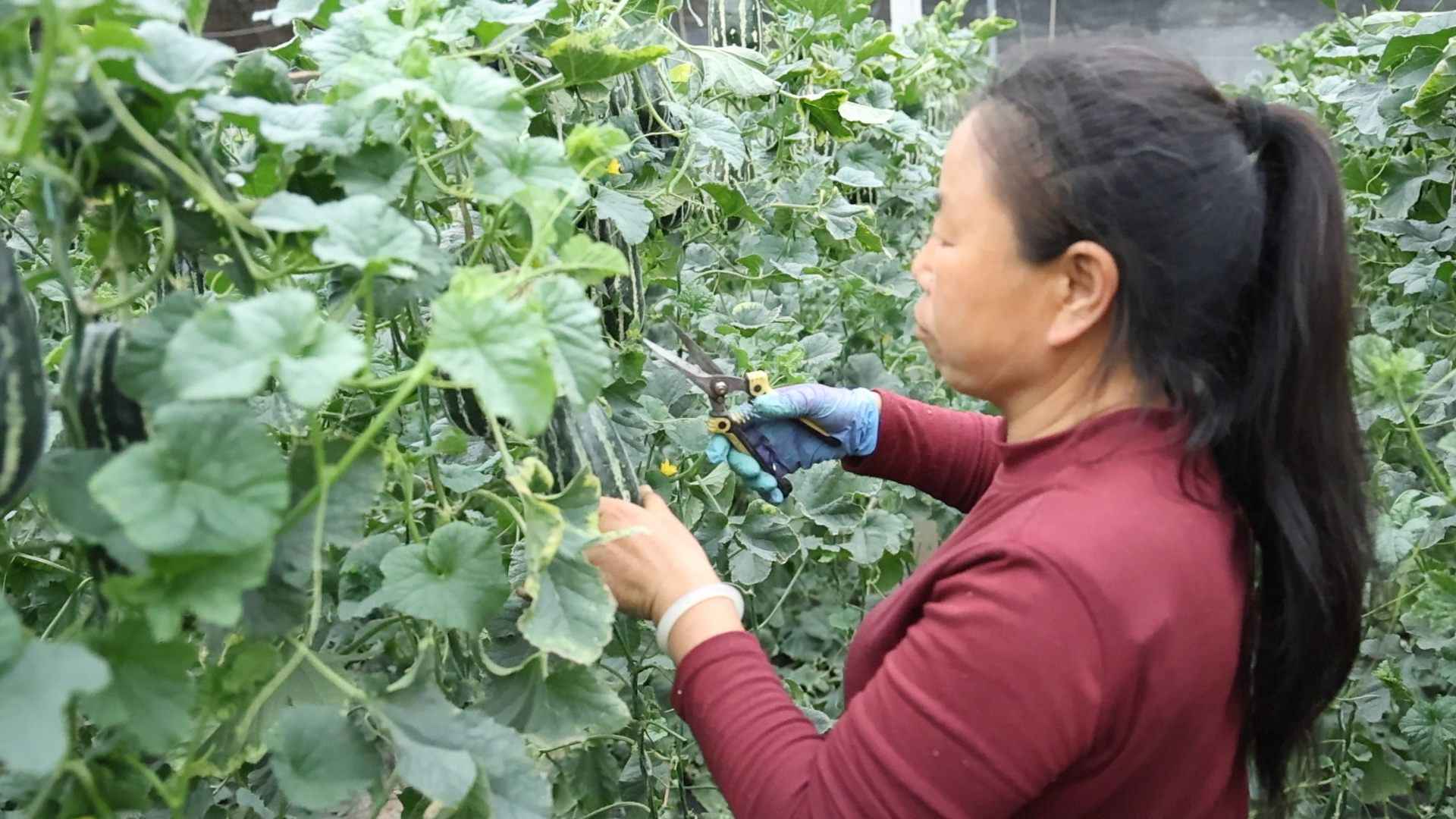 郭振峰种植小吊瓜已有三个年头。三年前,他响应发展特色种植的号召,在自家大棚里试种了第一批吊蔓西瓜。与传统地爬西瓜不同,小吊瓜采用立体吊蔓栽培技术,让瓜藤顺着搭好的架子向上生长,不仅节约了土地、提高了通风透光性,结出的瓜果还更加周正、甜度更高。“第一年心里也没底,但镇上的农技专家手把手教,从育苗、整枝到水肥管理,每一步都盯得很紧。”郭振峰回忆道。如今,他早已从“门外汉”变成了“土专家”,大棚管理得井井有条。