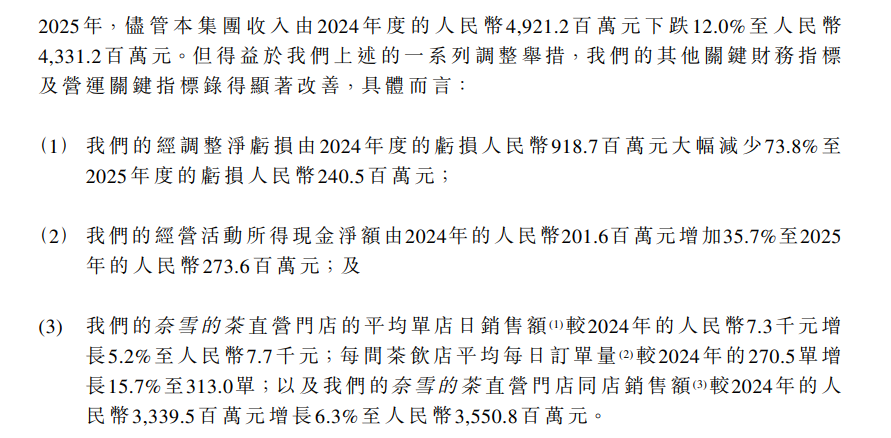 2025年,奈雪的茶经调整净亏损2.41亿元,虽较2024年9.19亿元的巨亏收窄73.8%,但仍是新茶饮头部品牌中唯一亏损的玩家。对比之下,蜜雪冰城2025年净利润高达59.27亿元,古茗净利润31.15亿元,均实现百亿级营收与稳健盈利,而奈雪仍在亏损泥潭中挣扎。