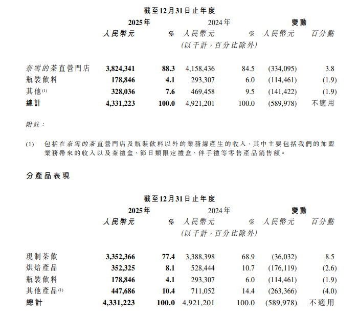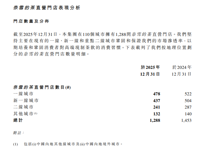 为扭转亏损,奈雪的茶启动大规模"关店瘦身"。截至2025年末,公司门店总数1646家,较2024年末的1798家净减少152家,为上市以来首次年度门店负增长。其中核心直营门店从1453家锐减至1288家,关闭超160家低效门店,加盟门店虽小幅增长,但难掩整体规模收缩的颓势。