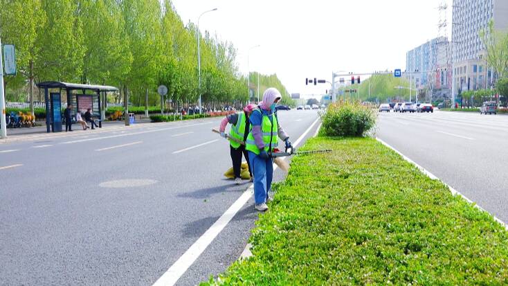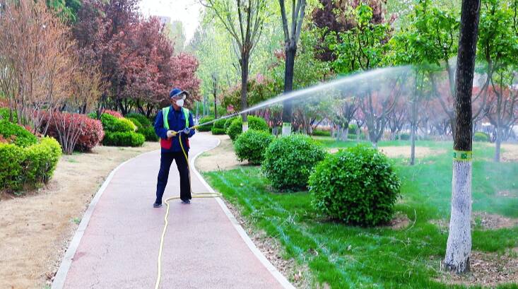 张店区综合行政执法局养护科工作人员汲薇介绍:“我们持续开展植被修剪作业,对道路、绿地内的乔灌木和绿篱进行规整修剪,及时清理枯死枝条,助力绿植健康生长。截至目前,累计修剪乔灌木3.1万株、绿篱3.5万平方米。同时,同步开展绿地清园整治,全面清理枯枝杂物,彻底消除绿化管护死角;针对春季病虫害高发特点,集中喷施石硫合剂和刺蛾防治药物,从源头降低病虫害发生率;此外,根据土壤墒情科学开展绿植浇灌作业,切实保障苗木水分供给,为植被生长保驾护航。”