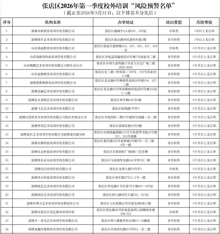为进一步规范校外培训市场秩序,强化培训资金全流程监管,切实保障家长与学生合法权益,4月9日,淄博市张店区教育和体育局正式公布2026年第一季度校外培训风险预警名单,共计67家培训机构被列入预警范围,覆盖学科类与非学科类培训。