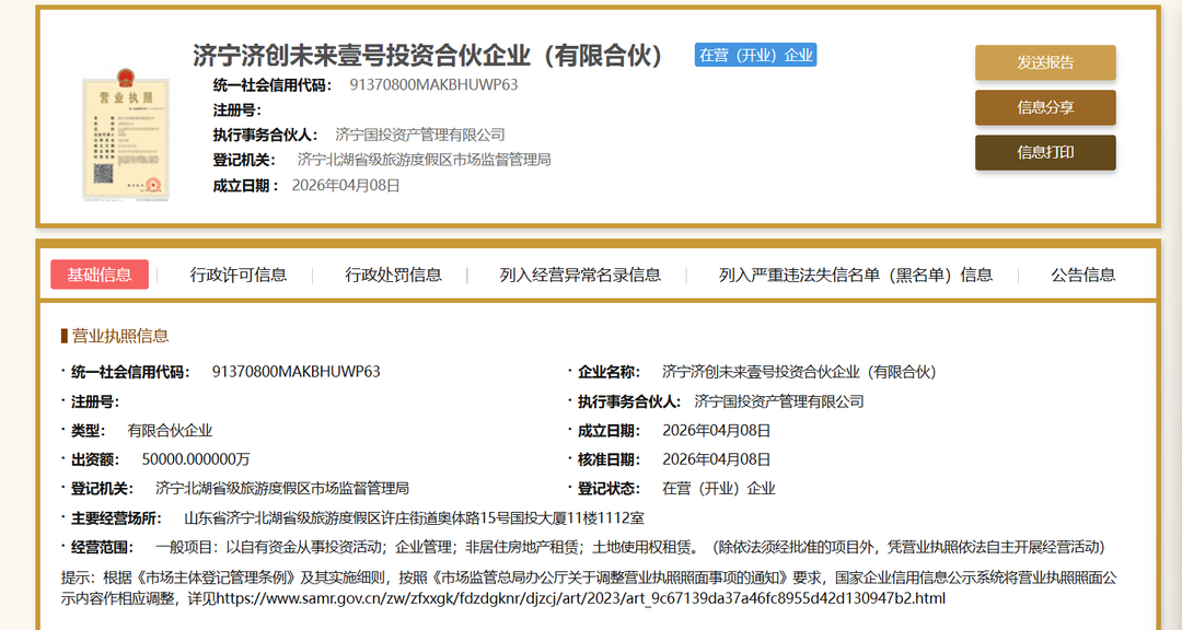 国家企业信用信息公示系统显示,济宁济创未来壹号投资合伙企业(有限合伙)(下称“济创未来壹号投资”)于4月8日注册成立,总出资额5亿元,主要经营场所位于山东省济宁北湖省级旅游度假区(太白湖新区),经营范围包含以自有资金从事投资活动、企业管理、非居住房地产租赁、土地使用权租赁。