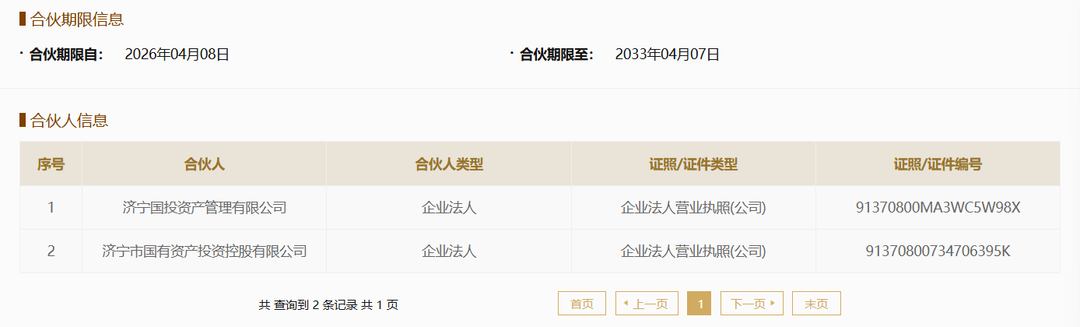 从合伙人信息来看,济宁市国有资产投资控股有限公司(下称“济宁国投”)认缴出资额4.5亿元,出资比例90%;济宁国投资产管理有限公司出资额5000万元,出资比例10%。济宁国投资产管理有限公司为济宁国投全资子公司,济宁国投由济宁市财政局全资持股。