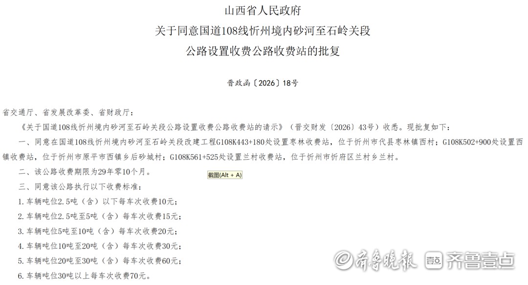 日前,全程170.358公里的国道108线忻州段,经山西省政府批准设置3处收费站,收费期限长达29年零10个月,各类客车和货车的收费标准从10元到70元不等。消息一出,引发广泛热议。