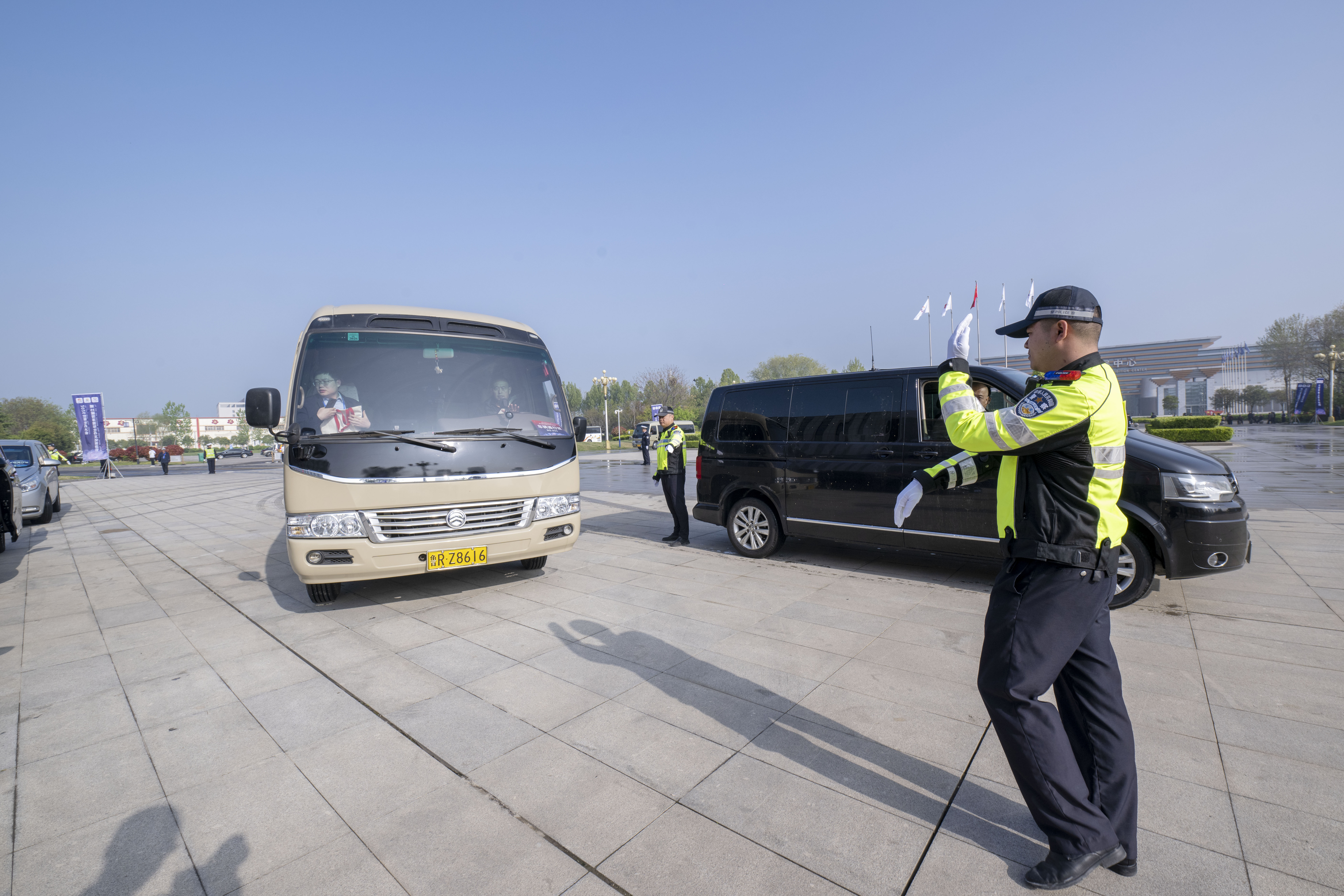 在会盟台活动中心,交警们提前到岗、科学布警,一边规范指挥疏导参会车辆有序通行、精准停靠,保障会场周边交通秩序井然;一边在人流密集的台阶区域定点值守,引导群众安全通行,及时回应群众咨询求助。
