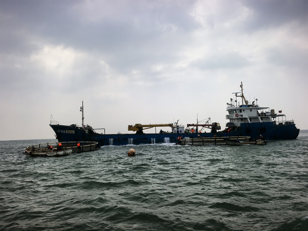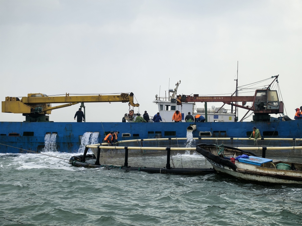 上午10时许,记者乘坐渔船到达距离岸边2公里的海洋牧场时,渔民们正通过管道将鱼舱内的鲈鱼高效地输送至巨大的圆形网箱中。
