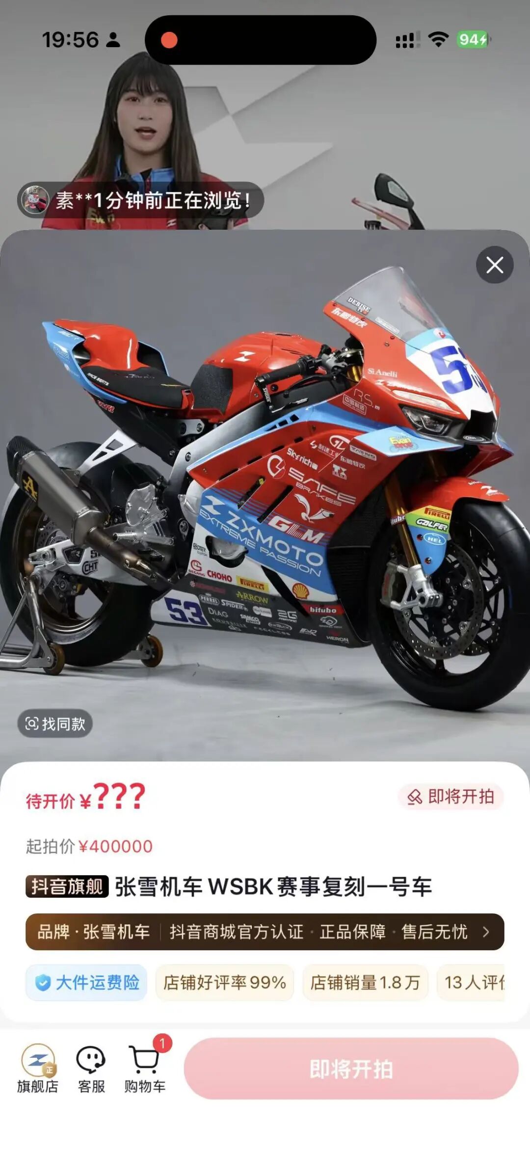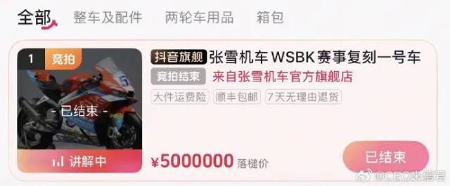 4月10日20时,张雪机车直播拍卖WSBK夺冠赛车53号复刻版。据媒体报道,此次拍卖设置金额上限500万元,包含赛车整车、圈速奖杯及冠军签名帽。