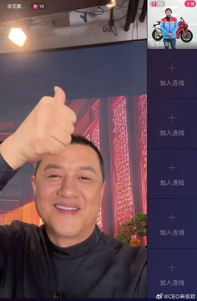 4月10日,李亚鹏在直播中透露将在晚上8点暂时停播,带5万粉丝去张雪直播间表示支持。