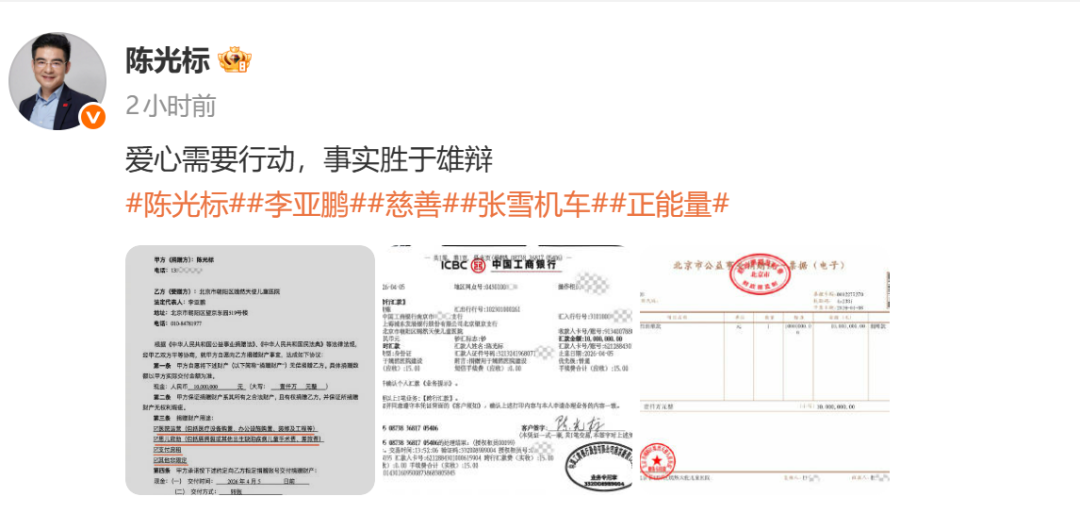 此前,李亚鹏在直播中针对陈光标向嫣然天使儿童医院捐赠1000万元一事作出最新回应。他澄清外界关于“捐款限定用途”的说法,确认该笔款项未设限制,全力支持医院运营。同时否认网上其“删除与陈光标的相关视频”的传闻,称从未发过双方相关视频。同时对陈光标的善举表达了感谢。