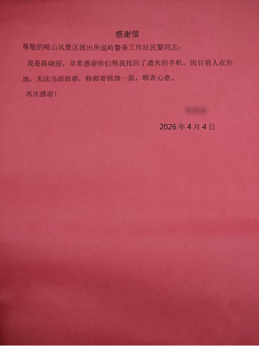 近日,青岛市公安局崂山分局风景区派出所返岭警务站收到外地游客张女士寄来的一面锦旗和一封感谢信,字里行间满是对民辅警的由衷赞誉,传递着警民同心的温暖。