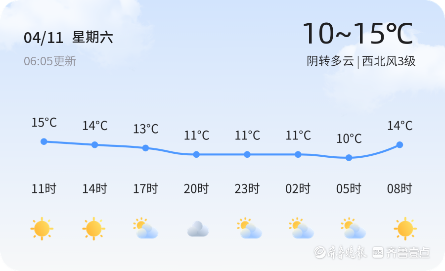 今天是4月11日,星期六,农历二月廿四。威海市今日天气为阴转多云,气温在10℃至15℃之间,西北风3级,空气湿度68%,PM2.5浓度为49,空气质量状况为良好。当前温度12.8℃,市民出行时建议携带雨具,注意保暖。
