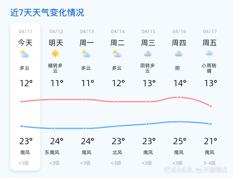 今天是4月11日,星期六,农历二月廿四。泰安市今日天气多云转晴,气温介于12℃到23℃之间,北风0级,空气湿度较高,PM2.5指数为49,空气质量良好。各区天气情况总体一致,均为多云转晴,适合户外活动。